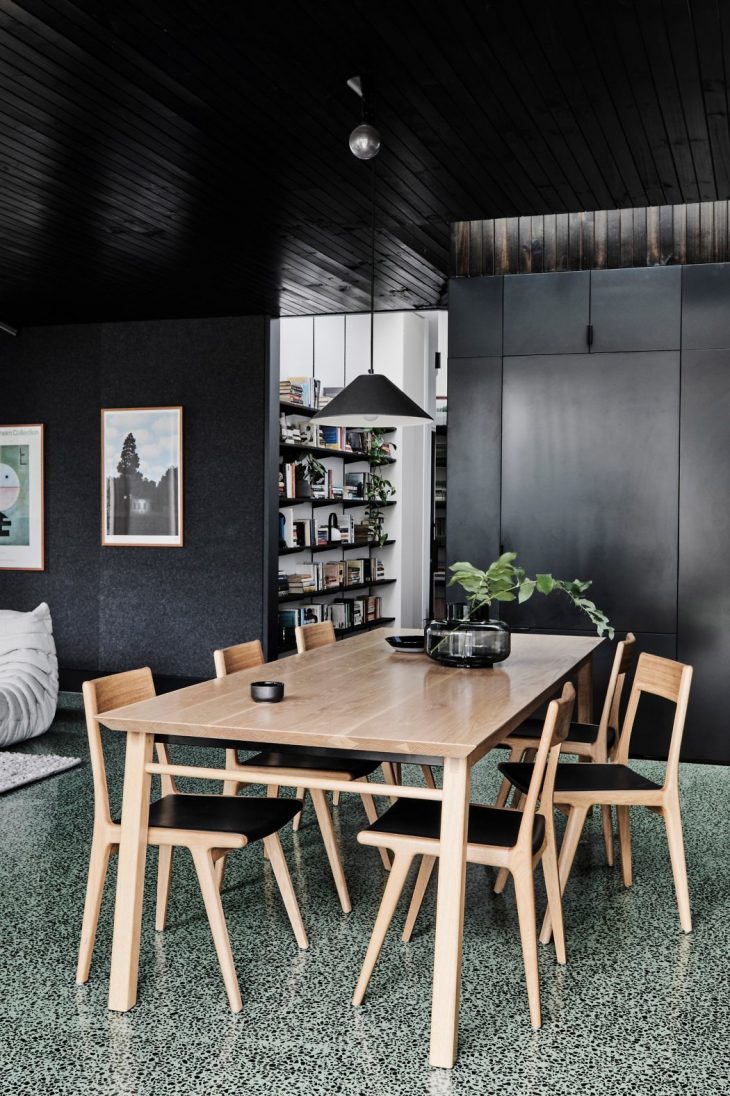 For the client, creating a space that would also accommodate their diverse collection of artwork and literature was also an essential part of their brief – a family favourite being the much-loved print of Kandinsky’s Upward (Empor). This offered an opportunity for us to draw upon some of the artwork’s beautiful geometric and tonal elements, which in turn formed a reference for the interior palette within the new pavilion space. The result is the interplay between the white walls and light-reflecting timber lined black ceiling, and perhaps most noticeably, the striking sage green concrete floor flecked with dark local bluestone.