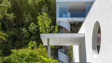 The qualities of the soil and environment where coffee is cultivated have a big impact on its quality. Furthermore, because of how easy it is to identify by aroma, the beverage may be the one that is most associated with air. Earth and air were excellent sources of inspiration in this regard. Both heft and lightness. As a result, the development of the two key components that symbolize this difference allowed for the materialization of this idea. The two thin, curved, white slabs that “float” over the house represent the air, while the heavy, colored side walls of the building represent the ground. The walls, which appear to be growing out of the ground, are supported by them like two sheets of paper.