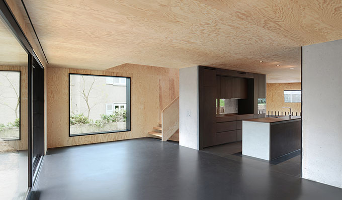 From the architects: Close to Basel, in an environment of family detached houses, we propose to realise one house of 6.5 Rooms with two main conditions: short execution time, and a tight budget. The object is inserted inside a plot already occupied, belonging to the parents of our client.