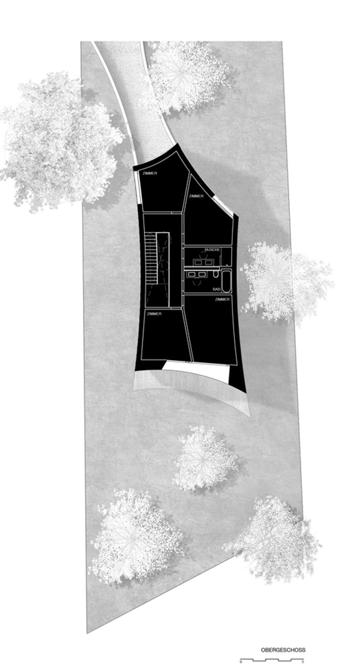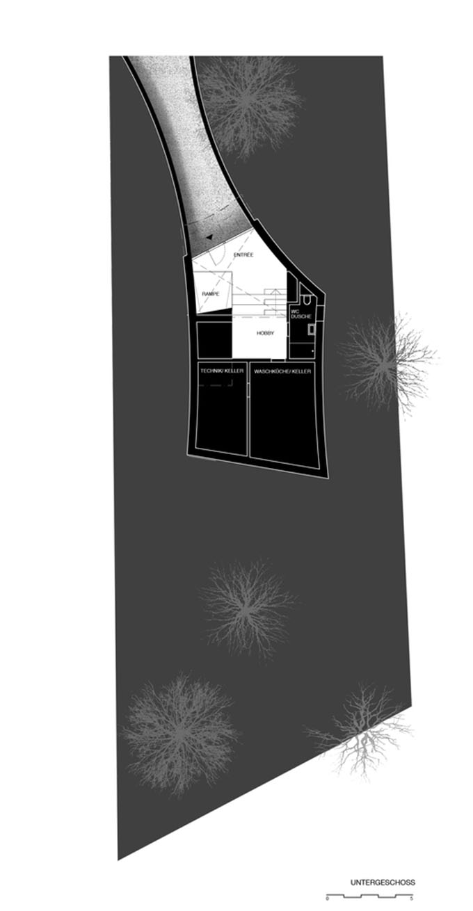 The reduced dimensi- ons of the place, with North-South orientation on the long side, and the desire to share part of the garden, made it necessary to understand how is working the main house. This large semicircular house, was made in the 80s by the architect Max Schnetz. The spatial rotundity and the proximity to the future building, established a formal language to design the new object. We look for a curved form within the most known economic variable, which is, by de nition, „the Swiss box“.