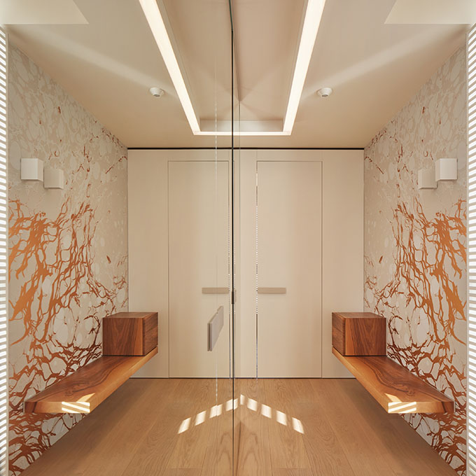 The zones in the apartment are multifunctional, and they do not always reveal their primary function at first glance – the mirror cubicle of the rectangular floor plan hides a built-in wardrobe and a toilet with a shower. The entrance is perceived as a welcome space – whether for the owners or their visits, so it is made as representative as the other interior – after all, it is the first impression of the whole work. The sunlight entering the corridor is dazzled by a raster that not only softens and disperses it, but at the same time prevents the unwanted view from outside. The raster motive is also used on the rest of north-east oriented windows of the apartment. As in the whole project, the synthesis of the artistic and utilitarian function of the elements is valid here as well.
