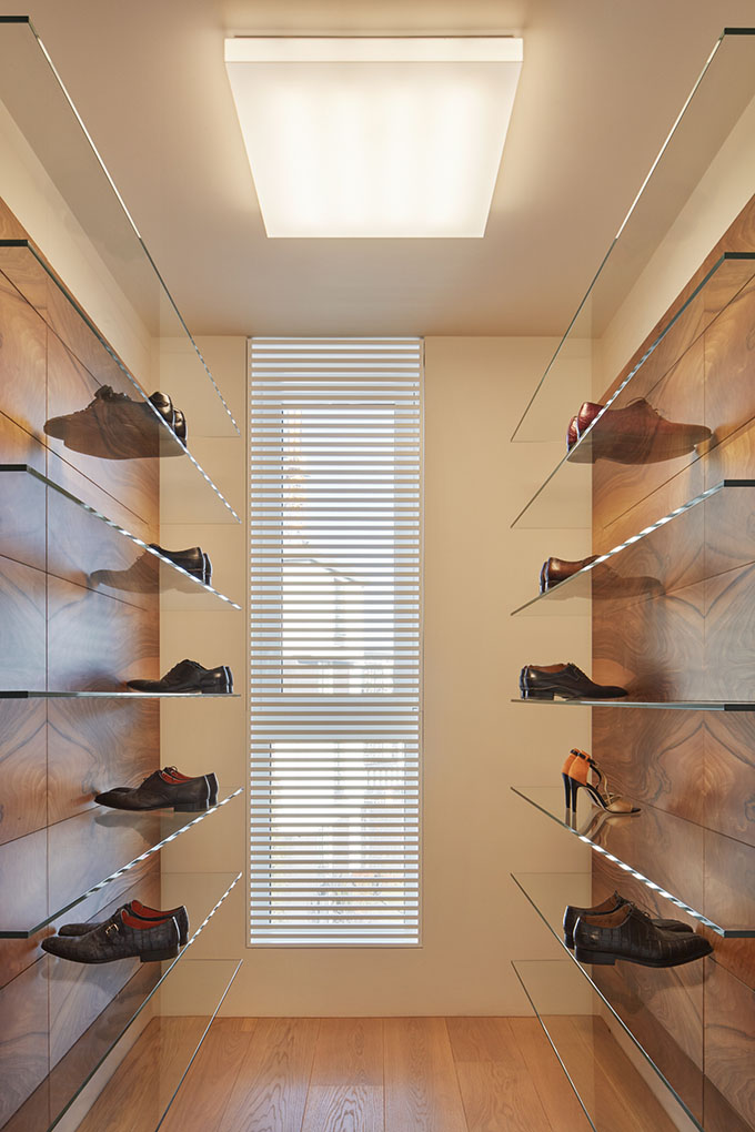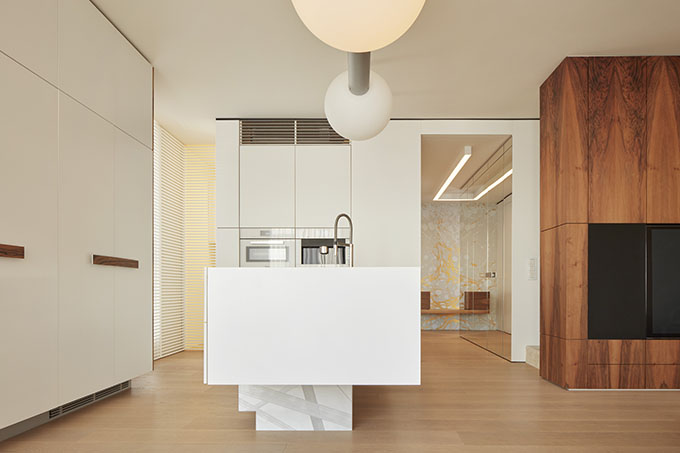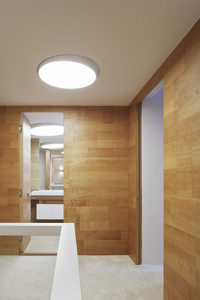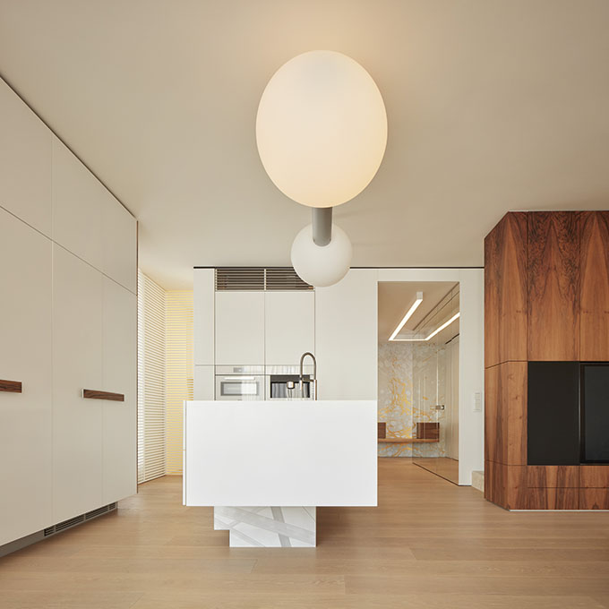 From the designer: The assignment for me as the designer and my studio – as the implementer, was as follows – Recreate a relatively new, medium sized maisonette apartment in Prague city centre for the needs and level of cosmopolitan couple, while I got almost unlimited freedom as the author. Inspired by modernism and the love of the Tugendhat villa in Brno, I drew the concept from just these sources – not as formal as ideologically rather. As the clients, constantly on the road, should use the flat as a point of contact and a haven, I had the pleasure to create it calmly and comfortably, with a spark of playfulness – what I was aiming for in a purely geometric scheme, simple to strict shapes and a noble material scale supported by uncompromising craftsmanship. The project originated as a Gesamtkunstwerk, a complete author craft – the same principle as the architect Ludwig Mies van der Rohe applied at the end of the 1920s just in designing the mentioned villa. All of the elements are related together, continuously follow each other or deliberately contrast.