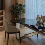 The patio spaces will be more important than the ones built, as these are the elements that make the house work. The glazing, 6 meters wide, slides only with mechanical support – it opens up for the family’s special moments and turns the house into an open space merged with the quadrangular patio. At the same time, this large glazing when opened creates a mini enclosed patio adjacent to the pantry.