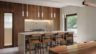 The project was envisioned as a weekend retreat that could host gatherings and provide comfort for extended stays. To achieve this, the design expanded the house to include additional bedrooms and bathrooms while reconfiguring existing spaces for greater functionality. A key focus of the redesign was the relationship between the old structure and the new additions. The design reconfigured the existing spaces, transforming the former garage into a modern kitchen while keeping the living room in its original spot. By removing internal barriers, the living room was opened to the outdoors and connected to adjacent spaces, creating a more spacious and fluid layout.