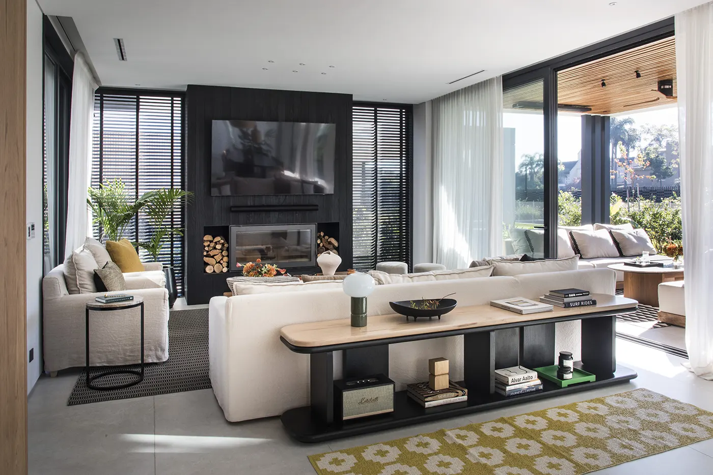 A key decision is the prioritization of continuity over fragmentation. Large‑format Italian porcelain tiles extend across the social areas as a seamless plane that recalls polished cement. This surface choice is both aesthetic and pragmatic: it simplifies maintenance, maximizes natural light, and reinforces the perception of the ground floor as a unified field. Rather than relying on strong chromatic contrasts, the interior is composed through a reduced palette, where textures take precedence over color. The calm solidity of the flooring and the chromatic discipline guide movement, mark spatial axes, and create a clear dialogue between architecture and furniture.