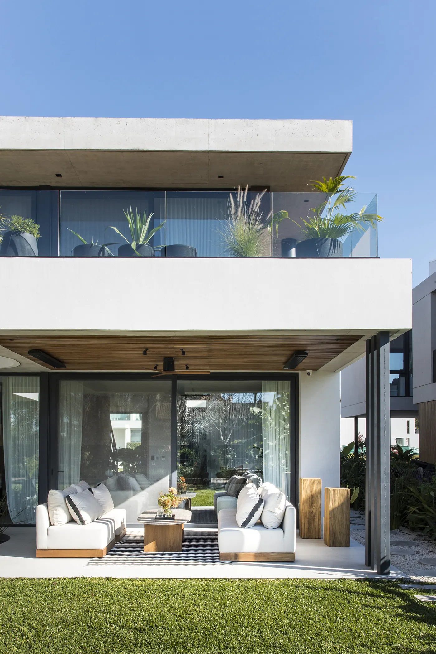 The gallery is where the project’s indoor‑outdoor ambition becomes most legible. A circular void in the ceiling frames an existing tree, turning it into a vertical anchor that connects sky, canopy, and ground. This gesture reveals the interplay between the linear rhythm of the wooden ceiling and the softer curves of the furniture below. The semi‑covered outdoor bar continues the interior’s material code, combining charred wood with a semi‑matte finish and a leather‑finished Brazilian black granite countertop. The patina of the outdoor pieces responds to the local climate, underscoring durability as a design value rather than an afterthought. Repeated furniture typologies and a subtle coastal reference create an atmosphere that is expansive and social, yet never slips into theme.