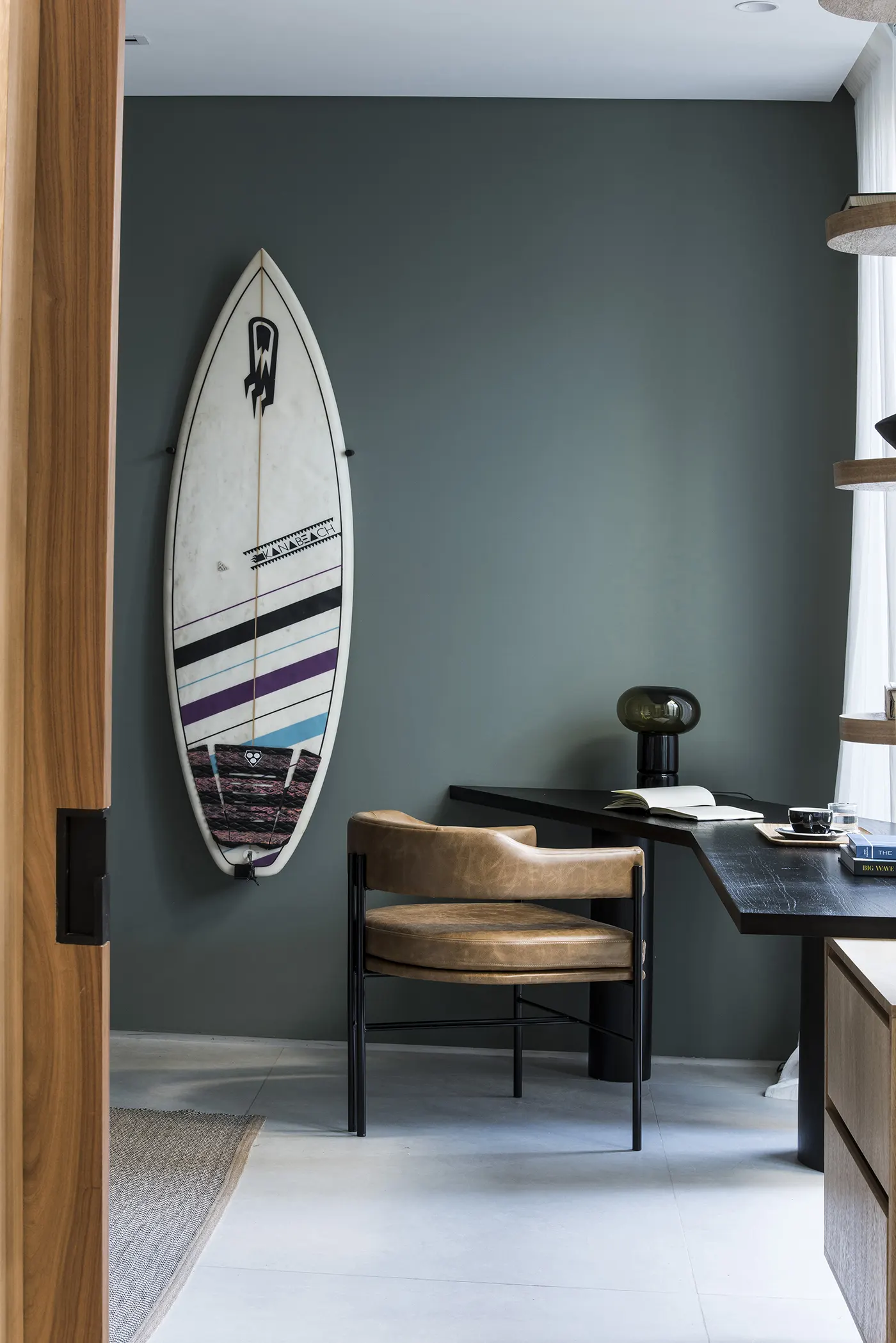 Custom‑made furniture is central to the project’s spatial and functional coherence. In the study, a curved wooden volume offsets the symmetry of the window and optimizes usable surface, while echoing the geometry of the dining table. This piece operates as a hinge between social and work areas, reinforcing the idea of integrated living rather than compartmentalization. Responding to the clients’ request for visual calm, Melazza Mobili limits the number of furniture typologies. The Carpano stools, for example, appear both indoors and outdoors, reinforcing continuity and reducing visual noise. Curves and straight lines, textured and smooth surfaces, are balanced in a way that resonates with the owners’ interests, such as surf culture, through proportion and material instead of literal motifs.
