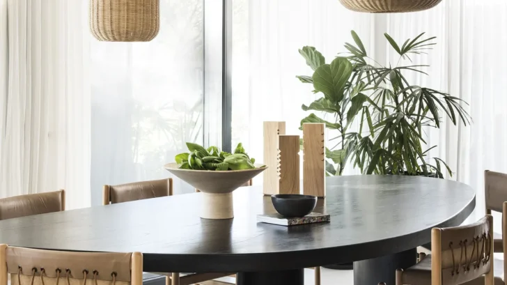 Wood becomes the primary tactile counterpoint to concrete. Indoors and on the gallery ceiling, white oak sets a warm, continuous tone that connects interior and exterior. Where more density and visual control are required, Melazza Mobili introduces charred wood, as in the Derto console behind the sofa or the Breta dining table. This darker material quietly conceals the integrated television above the fireplace, avoids introducing additional color, and adds depth without resorting to decorative excess. The lighting strategy reinforces this material family: Forma rattan lamps, also designed by the studio, are suspended at varying heights to introduce an organic gesture that lightens the strict geometry and subtly animates the social core of the house.
