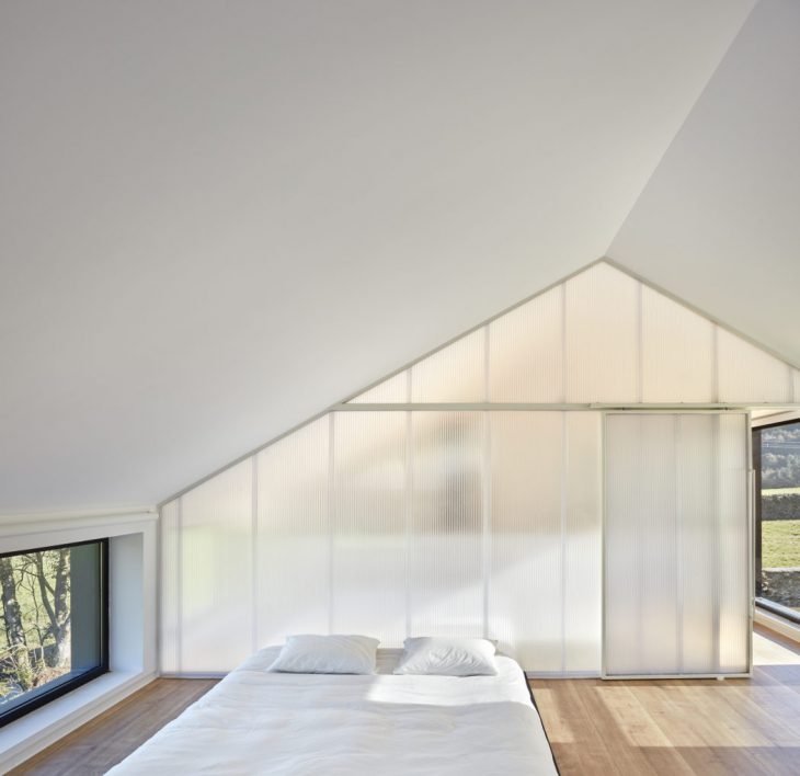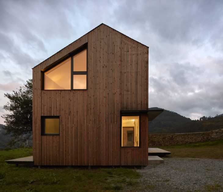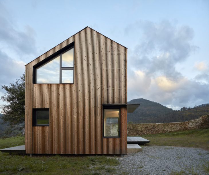 [baragaño] designed this stunning vacation home located in Valdés, Spain, in 2016. The house is developed in two levels, with a simple program that groups the installations in one of the three modules of 2.15 x 5.30 m that conform it. The central element of the residence is the metal staircase which forms the living and dining area around it . The upper floor boasta two rooms, separated by a light polycarbonate wall that sifts the light. Take a look at the complete story below.