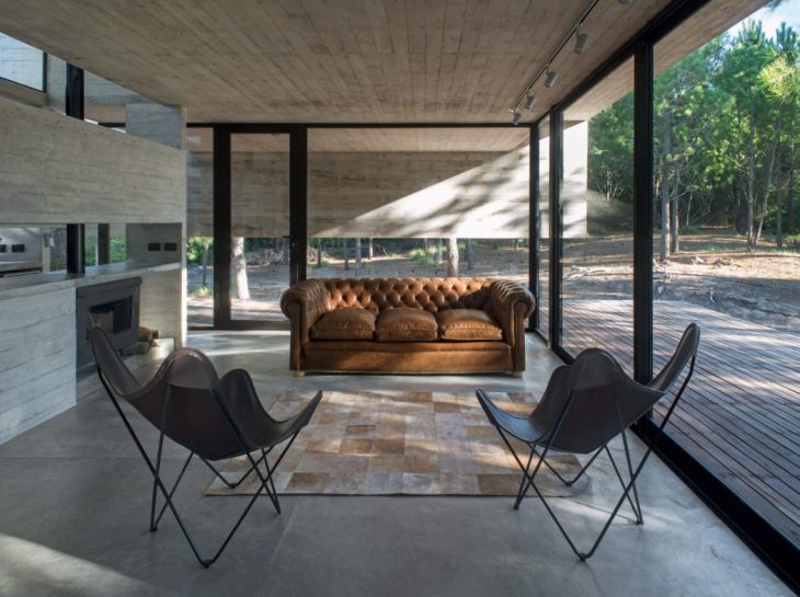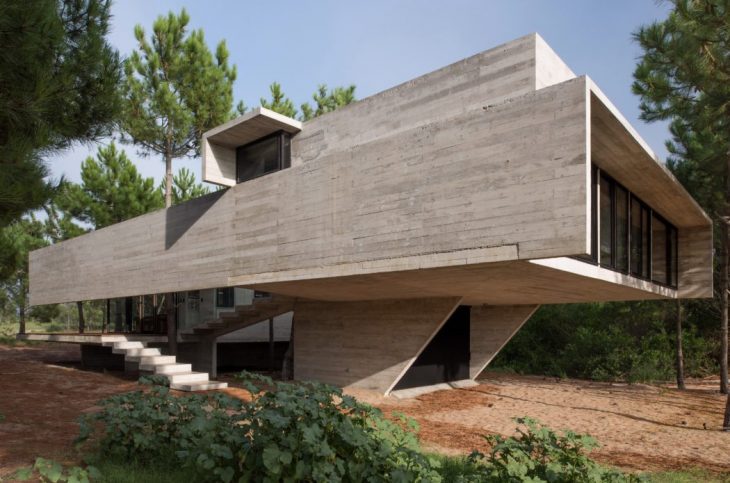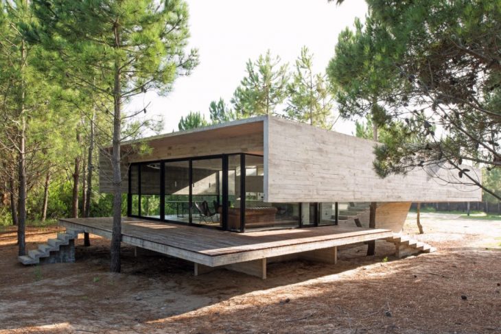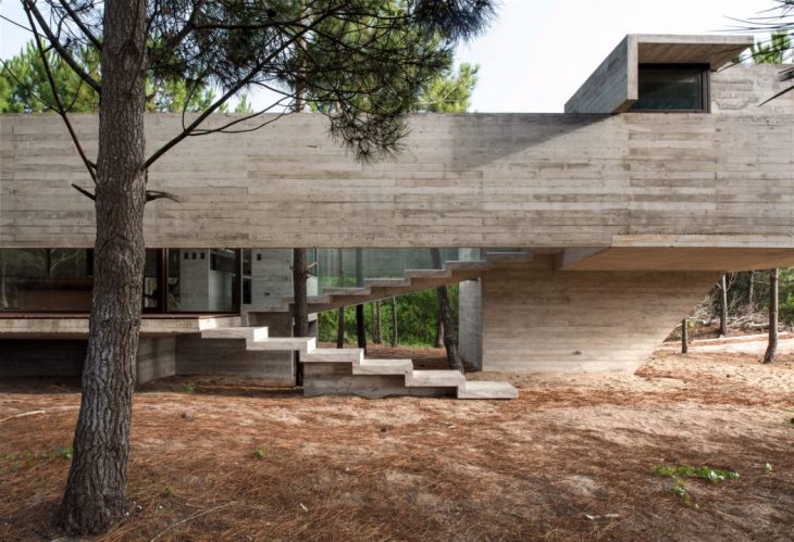 The commission consisted of a recreation house built entirely out of exposed concrete, with minimalist interior spaces and little maintenance requirements. The brief included two en suite bedrooms with their own closets and two cabin-like minimum rooms sharing a bathroom. So as to make the social area the most important place in the house, an external expansion was requested. Also, the client asked for a closed space for beach vehicles and a semi covered area parking lot. Special emphasis was laid on the need to establish a fluid relation between the inner spaces and the exterior, which would allow a closer experience of the forest.