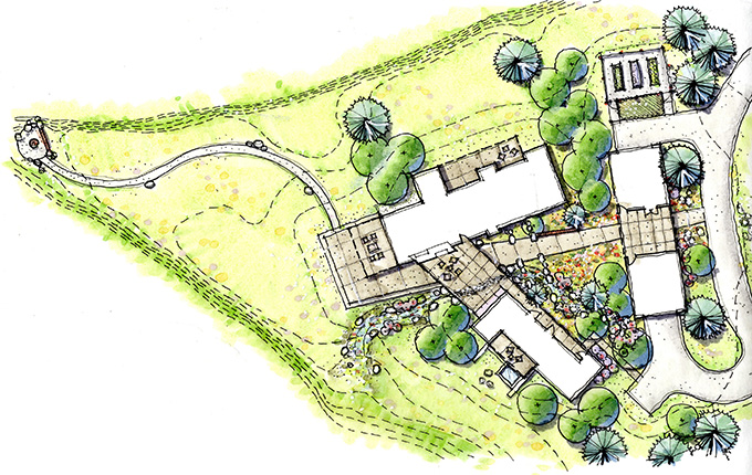 Composed of three structures in a loose triangular form—main house, guest house, and utility structure—the two living volumes (2,282-square-foot main house and 946-square-foot guest house) are aligned with the two converging river bluffs. The utility structure (garage and wood shop) form the third leg of the triangle and screen the house from the access road. Together, the three legs form a protected central courtyard.