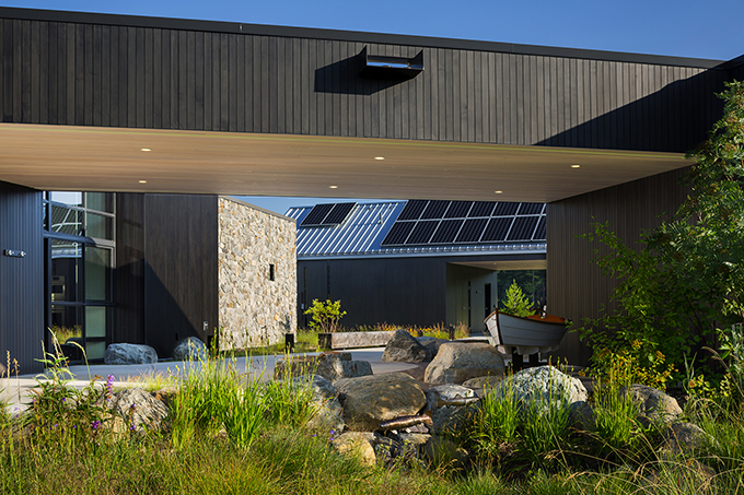 The flat-roofed living structures allow the complex to disappear into the horizon line. The main house, aligned with the west bluff, holds all the usual living spaces plus a study, piano room, large mudroom and pantry, and well-appointed master suite. A model of efficient space planning, there are no hallways. The guest house is separated from the main house to provide privacy. Connected via a covered porch, and aligned with the east bluff, the guest house contains two suites that can be combined to create a family-style suite, as well as a second study/exercise room. The covered porch between the house and guest house features a wall-mounted TV for outdoor movies. The utility structure, reminiscent of old railway maintenance sheds in the region, serves to screen the house and courtyard from the access road. It’s topped with an expansive solar PV system. The breezeway between the garage and shop ceremonially brings guests into the courtyard which is planted with native, drought-tolerant vegetation, mirroring the landscape around it. A stream bed flows through the courtyard, collecting rainwater that pours onto it from scuppers on the roof. Strategically sited boulders, and plantings of grasses and such perennials as Alberta penstemon and wild bergamot, meld with the surrounding ecosystem.