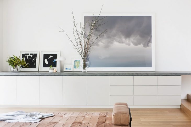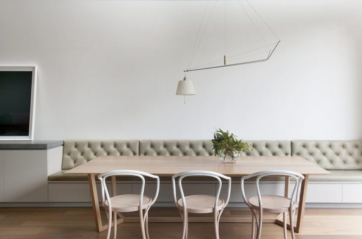 Modern amenities such as a lift, cellar, and butlers pantry were added to the house along with furniture and fittings that would bring the building up to the desired current standards. Linearity is achieved by methods such as built in seating and joinery, created to avoid interrupting this flow with superfluous furniture. Every room has a strong connection with nature; even the cellar we created with leather banquette seating has a low window looking out to the courtyard whilst also limiting sun exposure to the wine. As an integral aspect of our design response, we collaborated closely with a landscaper (Ed Purcey) on the external spaces to create the desired outcome of reflection and relaxation. The house opens to the outside and embraces the elements, resulting in the feel of a much larger space.