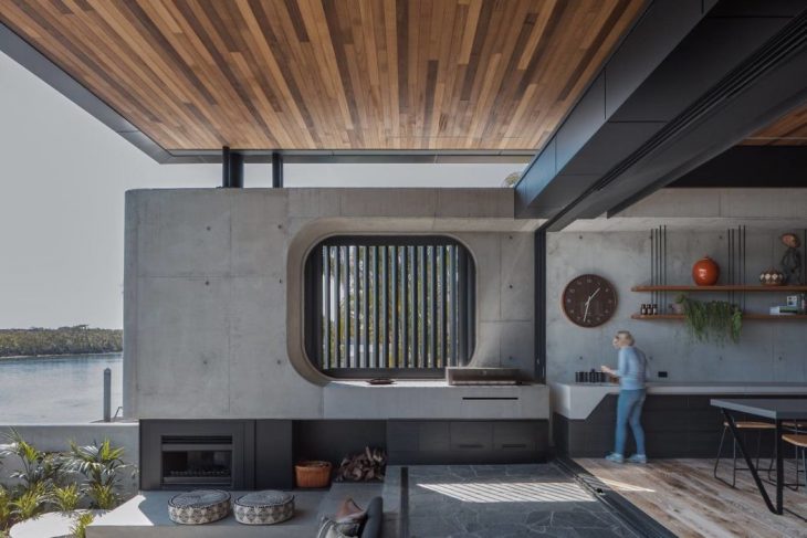 From the architects: Cove House is a robust yet elegant new residence in a waterside suburb south of Brisbane. An off-form concrete spine guides you through a delicate timber-batten screen and past a series of landscaped courtyards through to the water beyond. The courtyards act to define public and private space within the house while also allowing natural light to flood deep within the interior living spaces. The ground plane of the house is articulated with both raised and sunken areas to encourage engagement and reflection.