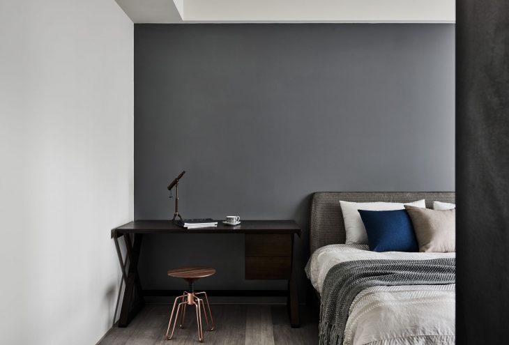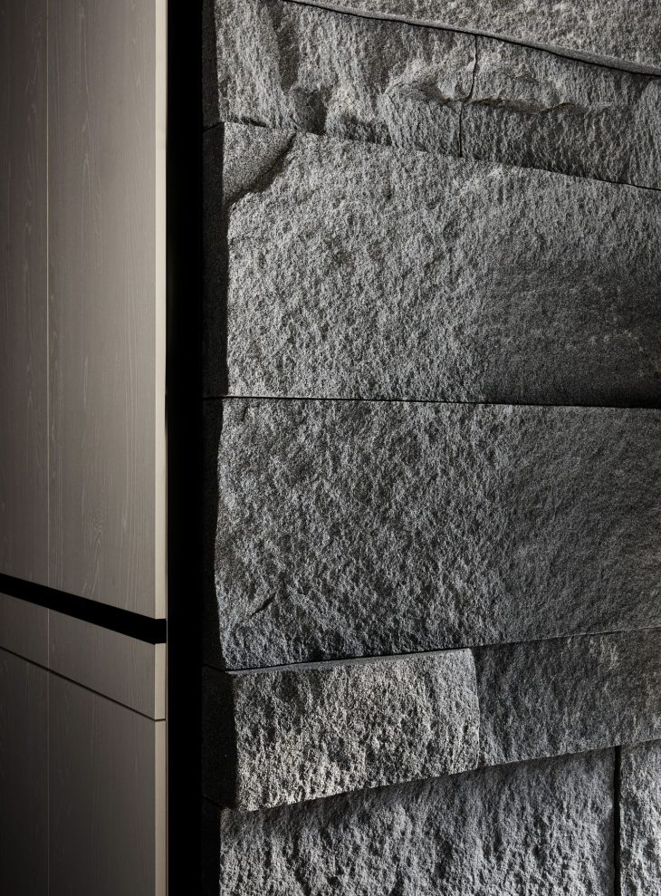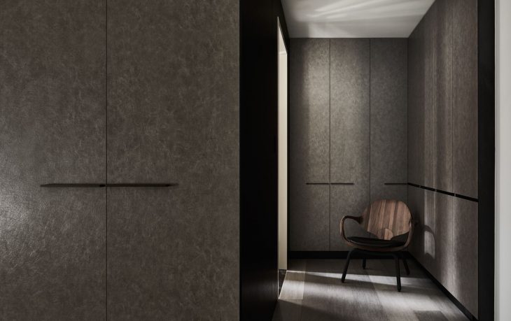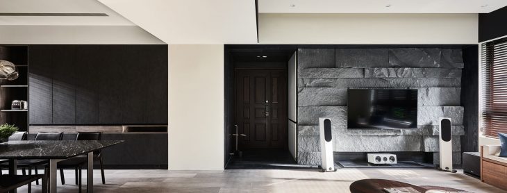 A restful man cave detaches from the hustle-bustle concrete jungle, a primeval model which is modernized by minimalist means and suffused with deep color scheme of forest and concepts of nature wilderness. Existing beams and columns without intentionally enveloping accentuate the cubic perspective of space magnification. Shelving and cabinets are methodically installed with plaster effects, whereas the living room TV wall accentuates the nature innate of coarse-textured rock stacks, sustaining sensationally intriguing contrast between modernity and natural landscape. While sunlight goes through dark wenge blinds, permeating lambent ambience, poised yet virile and inviting.