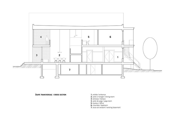 The new living area is characterized by a sequence of spaces, which revolve around the double height dining room. The degree of intimacy is modulated according to the usage. On the ground floor, a bench becomes a contemplative space extending the interior. Upstairs, the yoga room, which is largely open towards the garden, is flooded with natural light. In the master bedroom, a steel blades screen filters the views over the neighbourhood.