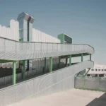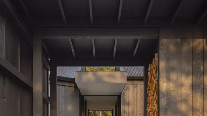 The architects split the gable into two volumes, aligning each toward distant views to the north and south. This move organizes the building around a central entry, where the two forms meet. The geometry of the site supports this arrangement, allowing the creation of a controlled arrival sequence. A linear storage structure screens vehicles and separates them from the living areas, while a small courtyard and turning area establish a measured transition from access road to interior space.