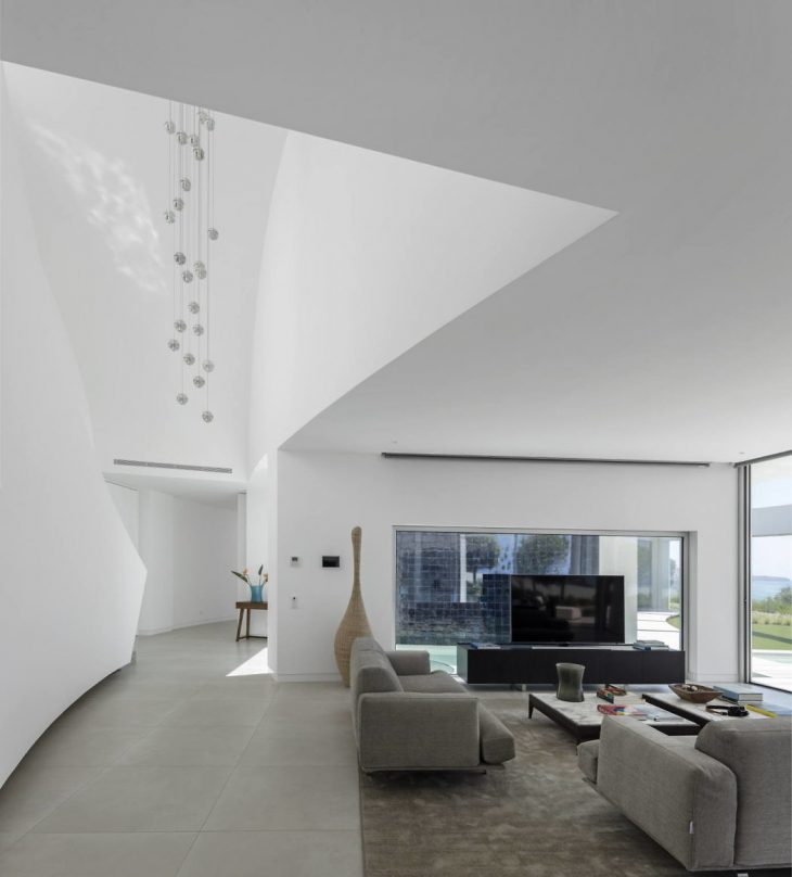 With its elliptical base, the house is deliberately sculptural and organic. It is shaped by the wind and the sea that wants to embrace the wide floating oval which subtly delimits the central patio of the house.