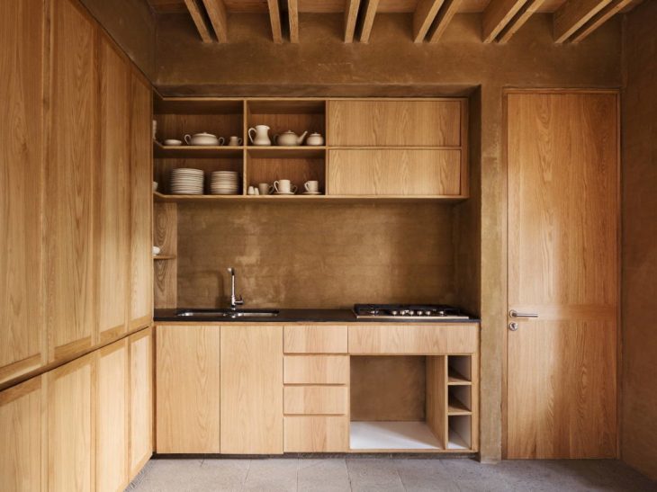 The materials, such as brick, wood and soil are all regional. The soil from the excavations has been taken and reused as the main material to cover the walls. Thereby, the architecture literally emerges from the ground.