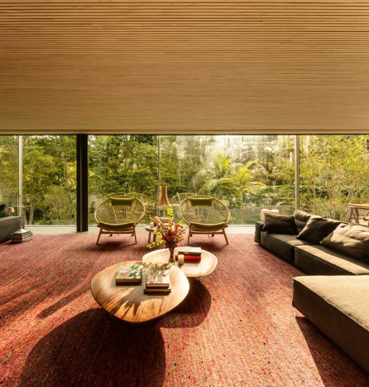 From the architects: The architectural promenade in Casa FIO starts in the garden on the ground floor and develops through a sculptural ramp which arrives at a deck with its colorful armchairs and a ground fireplace. Pitangueiras break up the ground. Continuing along the external living space, next to it you can find the totally glassed-in living room, in a very protected and cozy environment with its ceiling in light wood. The same material builds the materiality of the facade.