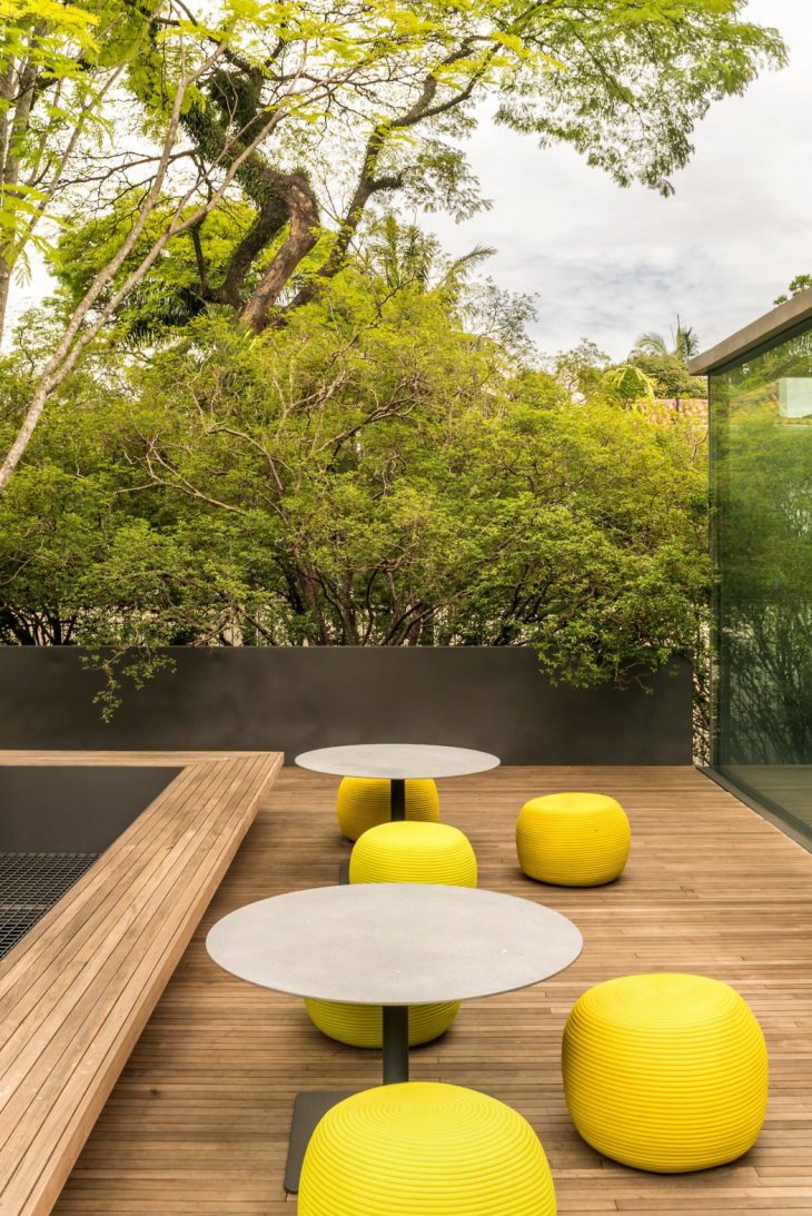 The ascent ends in a garden at the height of the branches of the trees. This area has the ground fireplace, which is used for any outdoor meetings on colder days and also works as the extension of the living room.