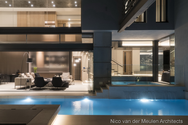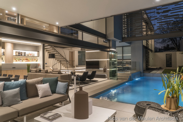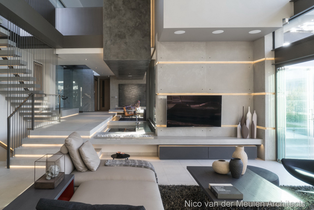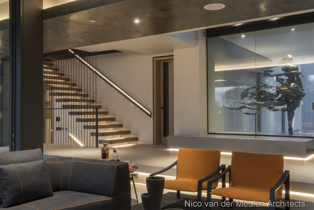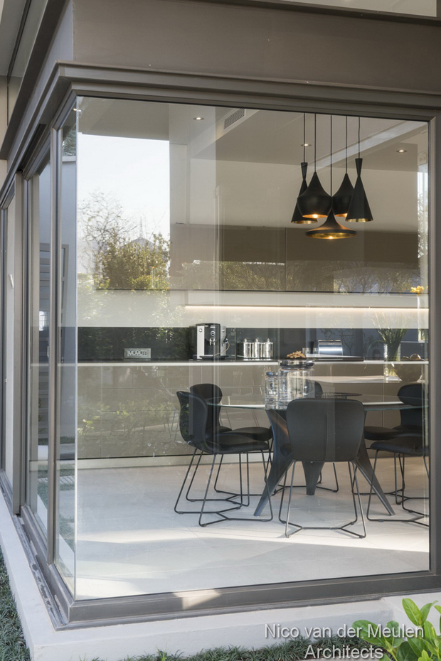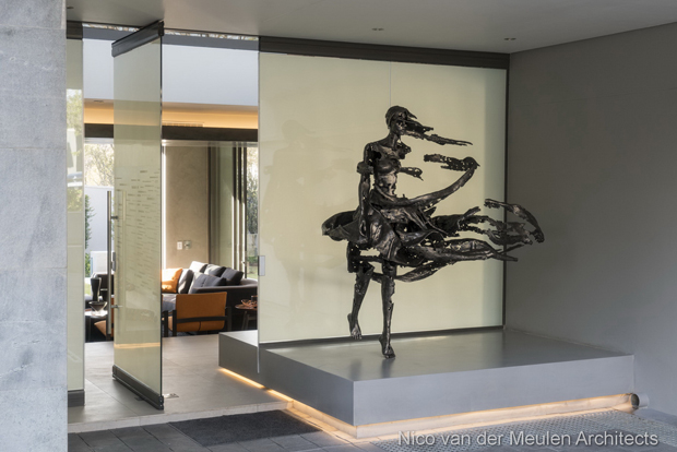 Upon approaching the home the first view is of the cantilevered porte cochere screen of suspended steel tubes with double sliding garage doors clad in dark limestone to blend with the wall. A steel sculpture by Regardt van der Meulen twirls on a podium next to the front door built of privacy glass. Upon entering the transparency of the house becomes evident with views out over the multilevel hall, lounge, spa and pool to the water feature and the garden beyond, as well as over the double volume family room, dining room, lanai and kitchen. The whole of the living/kitchen/ breakfast area opens totally through the use of frameless concertina doors to the lanai and garden. – from the architects