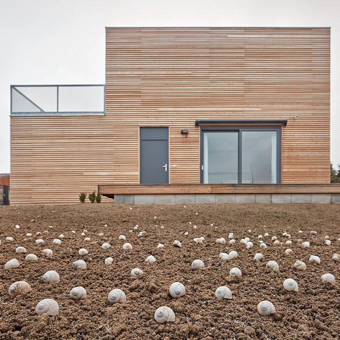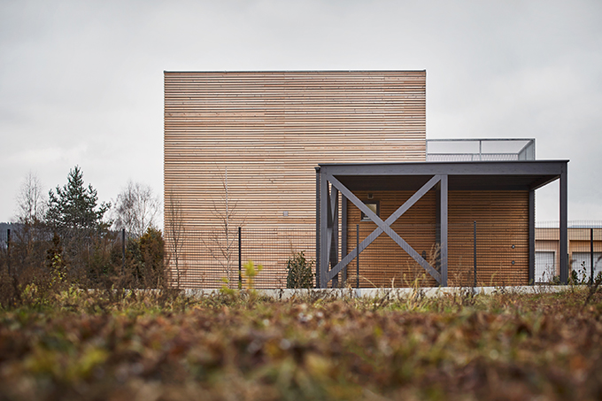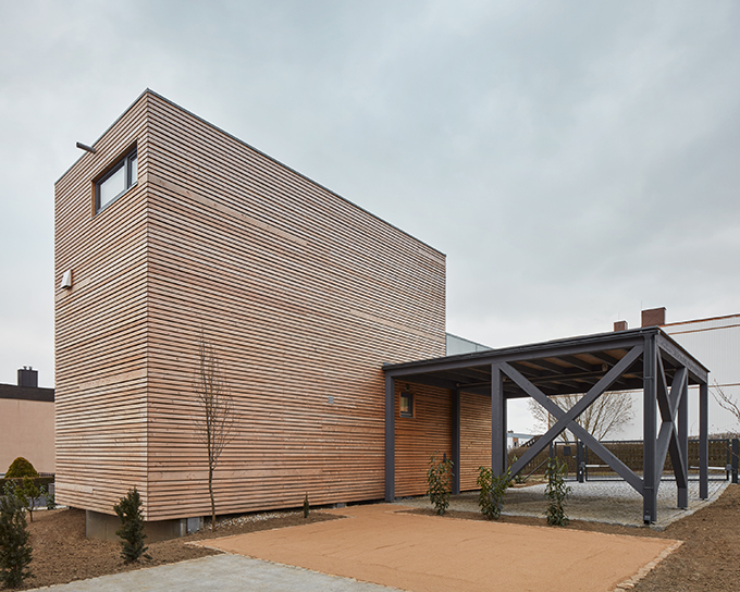 The “Sixty-one” is 95% wooden. Its bearing structure is from glued wood and has exact joints made according to a Swiss patent. Exact milling of the joint into the shape of a trapezoid are made very simply and their strength is immense. The insulation consists of wood fibre insulation panels that have a beneficial faze shift of day – night. The facade is diffusionally open, made of northern larch. The house is heated by radiant panels, ventilated through local recuperation, and windows are wooden with a triple glass panel. The house sits on five ground foundation strips. The interior is white and wooden and reflects the main construction materials of the house. Furniture is made of birch plywood with hidden hardware, the flooring and staircase from solid oak.