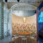 A contemplative mineral garden adds another layer of depth, positioned near a wall of glass blocks. The interplay of light and shadows throughout the day creates a serene atmosphere. Additionally, careful consideration was given to exterior lighting.