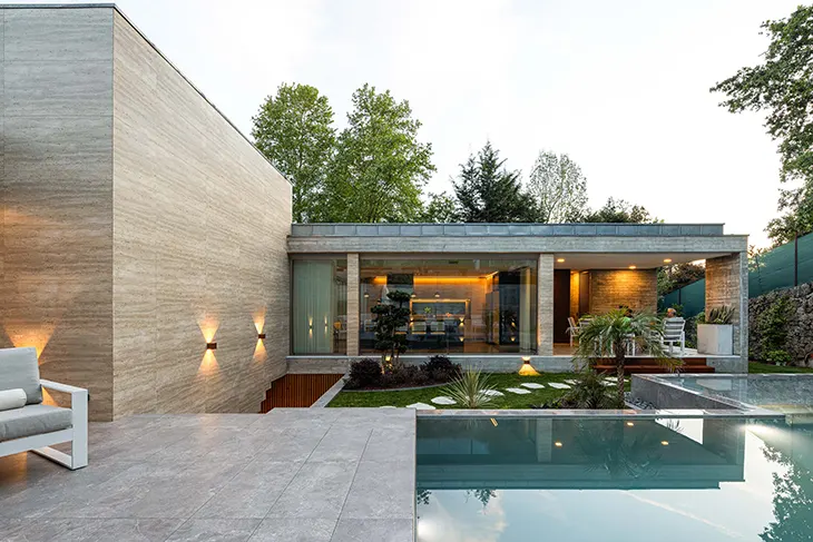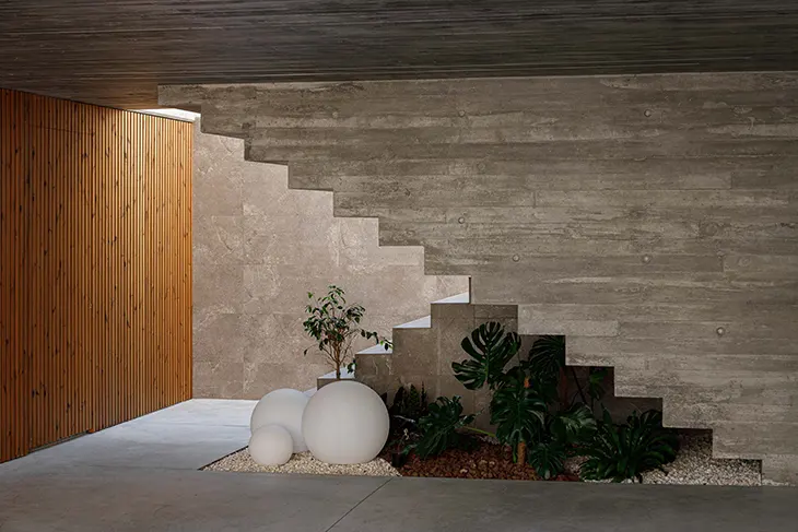 Materiality plays a central role in the architectural identity of Habitação CL. Exposed concrete, left raw and textured, defines the structure and asserts scale. Thermally modified wood brings warmth and tactile presence, while travertine punctuates the house with a sense of permanence and quiet refinement. These elements are not decorative additions but integral components of the architectural expression, creating a balance between honesty and elegance.