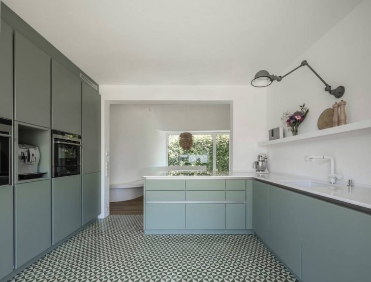 Accordingly, the rather complex spatial setting of the interior living landscape is answered by a neutral material palette. The white plastered walls and oak floors guarantee for a rather cosy basic tint. Only the kitchen with its dark green surfaces and traditional cement tiles shows a much more articulate approach to colour and texturing. In this way the spaces leave enough possibilities to be fashioned according to the taste and preferences of the inhabiting family.