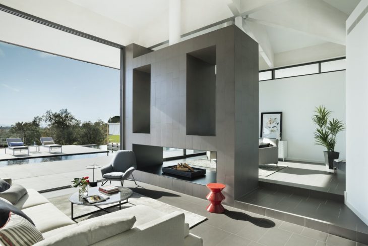 The 80 m2 open space living area is built into the hillside, and leads out onto a raised plateau that overlooks a solarium terrace and infinity pool, with an outdoor barbecue kitchen and in-pool daybed. A large double-sided fireplace breaks the living area into two light, open spaces with panoramic views.