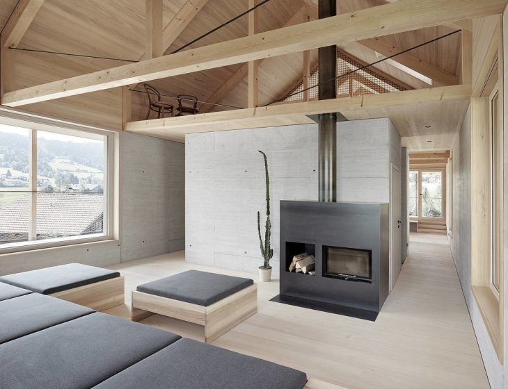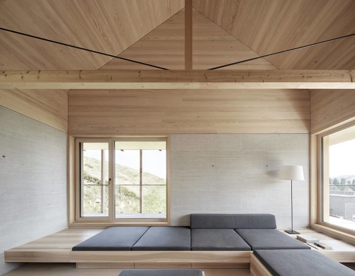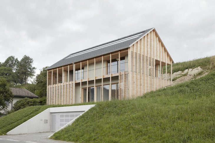 From the architects: Building a house in the picturesque Bregenzerwald valley in Western Austria, on a very steep hill outside the village centre, on a quiet road where several homes of varying size and artistic value had been built in recent years on both sides of the road. The The Höller House is – and will, for topographical reasons, remain – the last house on the northern side.