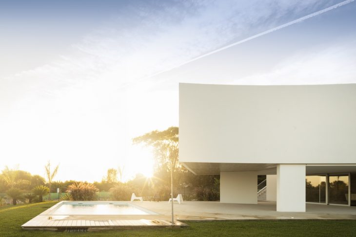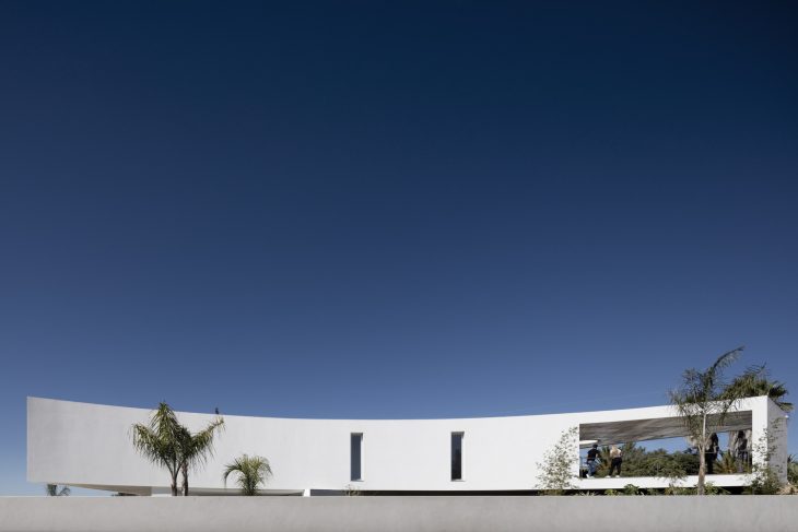 The image of the house is constituted by several curves that consist in the separations provoked by the surroundings. The topography is gently sloping, and the surrounding is characterized by a traditional style single-family dwellings from the 80’s. The land confines with a municipal street, which defines the entrance of the house. The project develops on a single floor (above the street level) with the intention of minimizing the visual impact of the viewer from the street and its implementation takes into account the better use of the solar orientation of the interior compartments and the best views that the site provides.