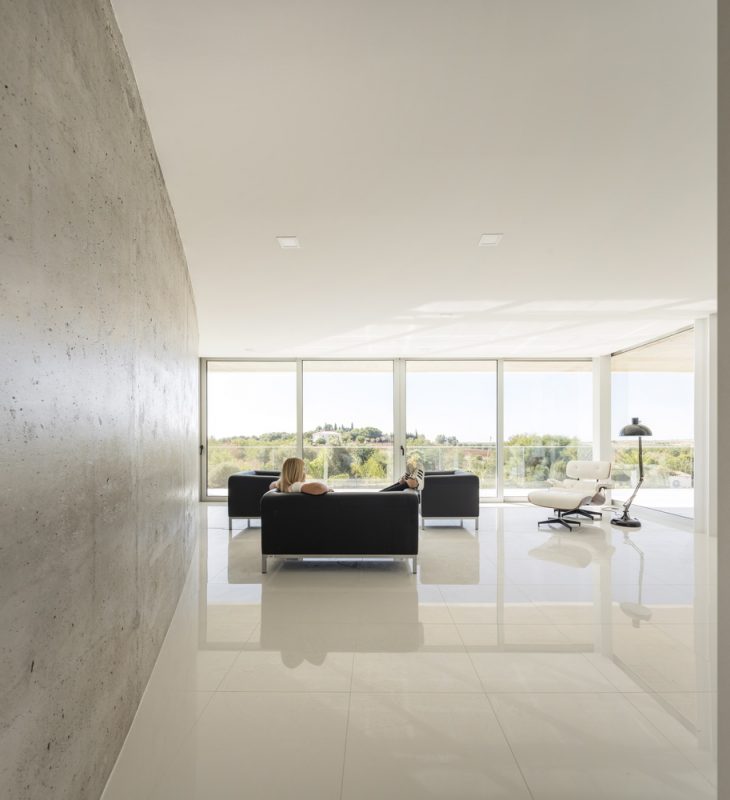 The villa consists of 2 floors, the groundfloor which is at the level of the entrance, and which comprises 4 bedrooms, living and dining area, kitchen and service areas, complemented by a car parking. The lower floor develops in the result of the natural slope of the terrain and integrates a living area, directly related to the pool. This lower floor benefits from an out o or covered area where the pool is located, creating very interesting relations between the interior and exterior.