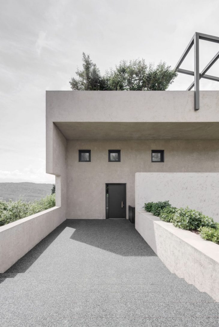The house assumes an introverted personality, not only because of its shape but also because of its materials. The facades feature a solid earth colored cement structure. Every opening seems to have been carved out from the original volume of the house by digging and pushing the solid mass. Through these voids a new relation with nature is established, providing the user with unexpected framings of the landscape, different in size, proportions and depth.