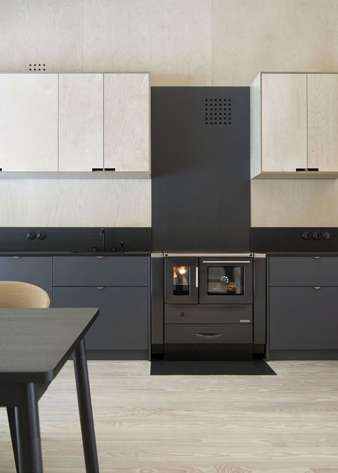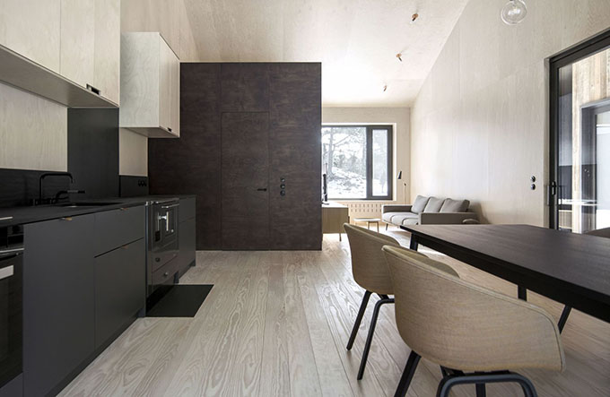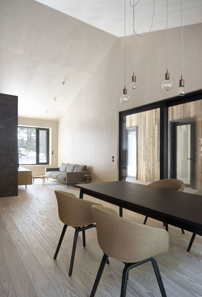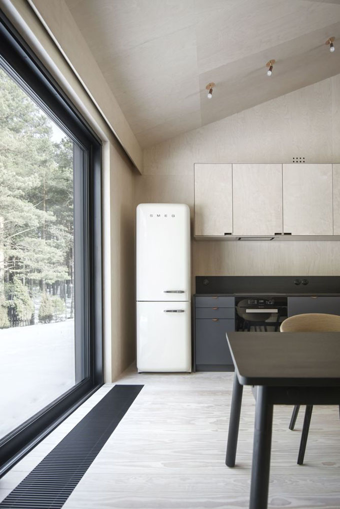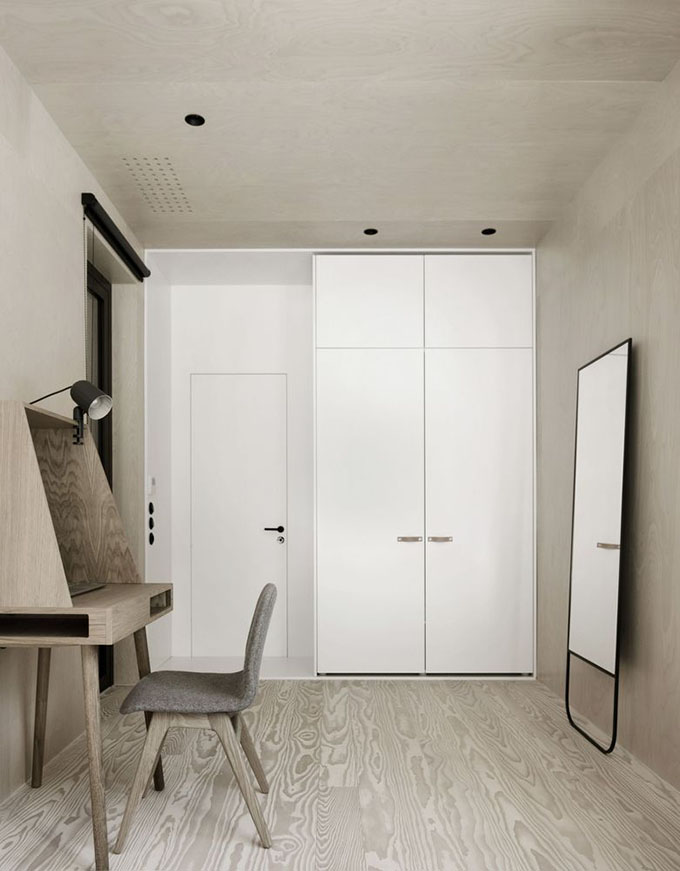 A laconic interior background is created with the help of Latvian birch plywood and Douglas fir flooring.