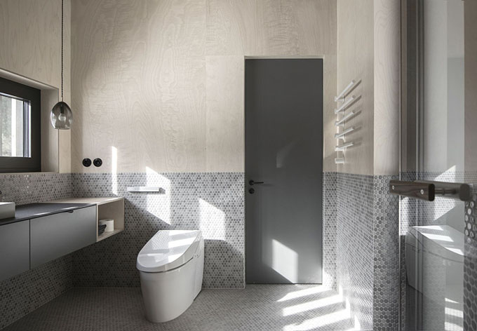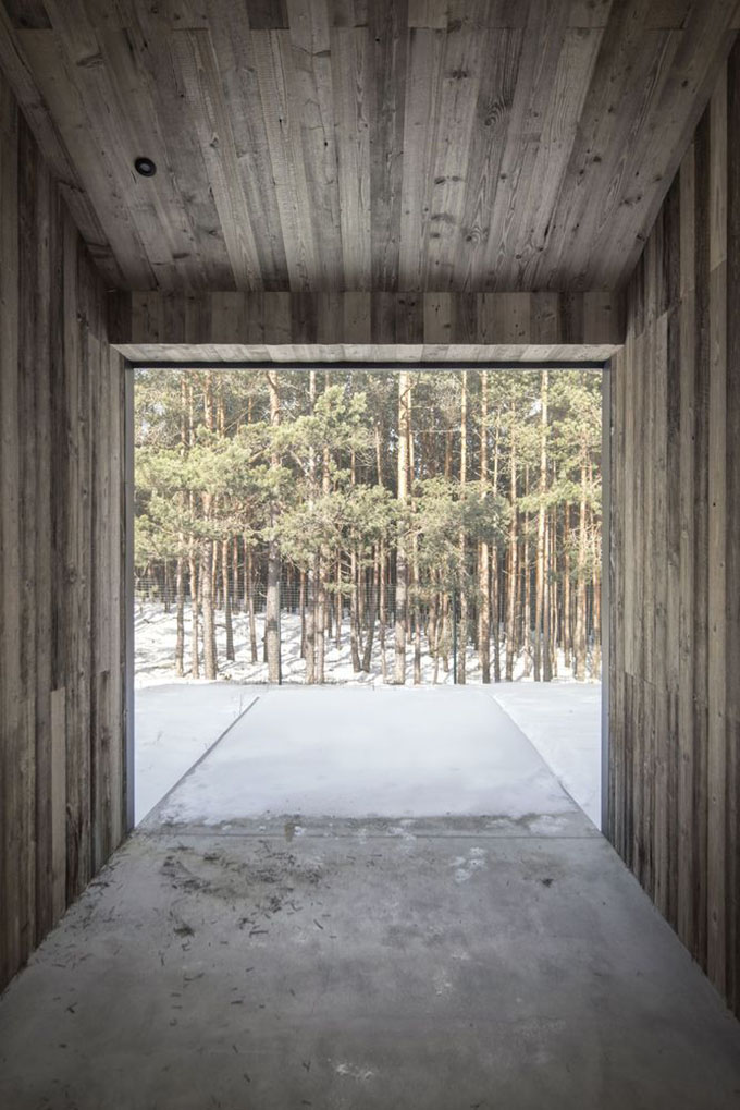 From the guest side of the house there is a small roof overhang and a mini-terrace for storing firewood for a wood stove in the living room. On the terrace from side of the main bedroom there is an outdoor shower. Interior of the house is minimalist: simple finishing, lack of catchy details and decor, ecological materials. Emphasizing the connection between the forest and the interior is the main concept of this project.