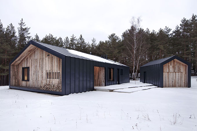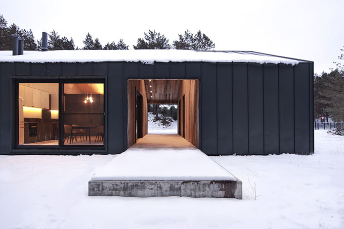 The house is functionally divided into two parts: the main and guest areas. Connection between the zones is carried out through an indoor passage in the building, which visually connects the courtyard with the forest. For external finishing and the terrace, Latvian granary board impregnated with a hydrophobic compound was used. The roof and facades of the house are finished with anthracite standing seam roof panels.