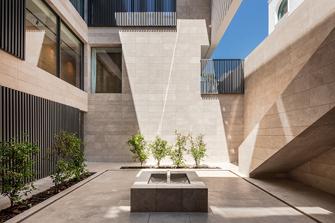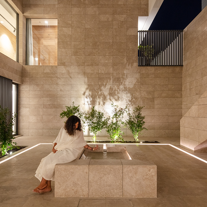 The house is organized around an internal courtyard cutting across all the floors. The U-shaped volume faces this courtyard in an Omani stone clad skin. The courtyard and the void results in an inward-looking typology that can benefit from maximum diffused daylight without compromising on privacy. The house, thus, opens up towards the interior featuring a private courtyard lined with citrus trees and a sculptural fountain reminiscent of the gardens from the Moorish Alcazars.