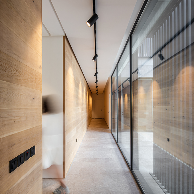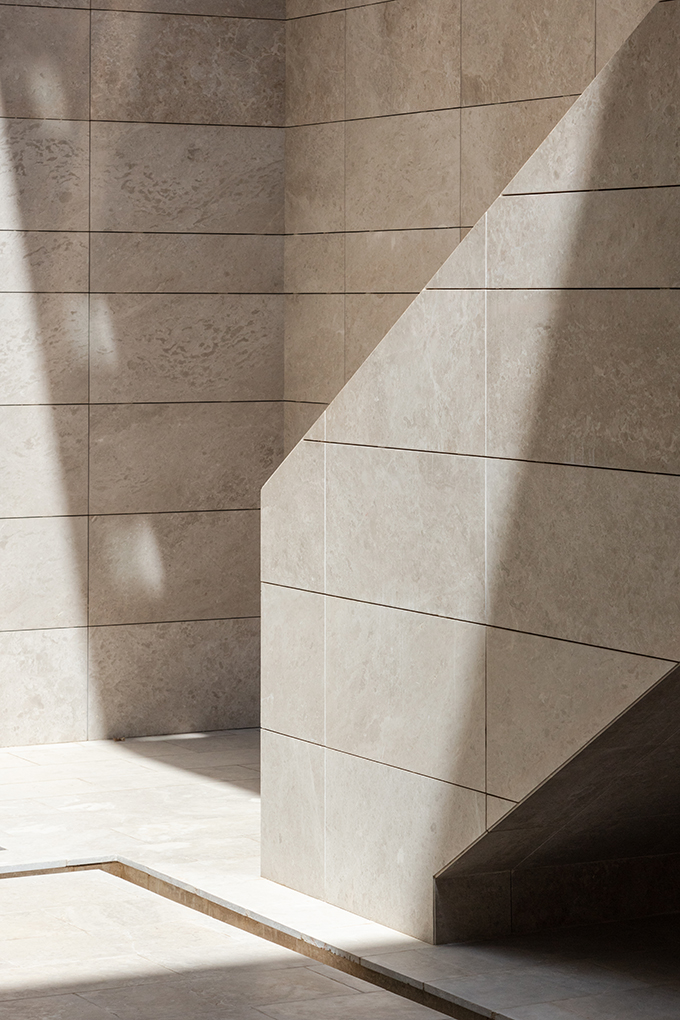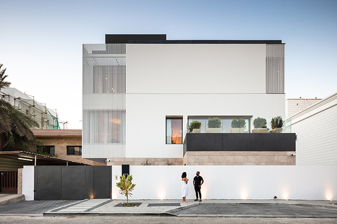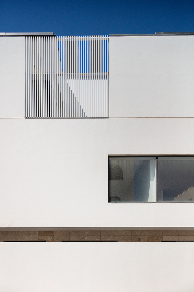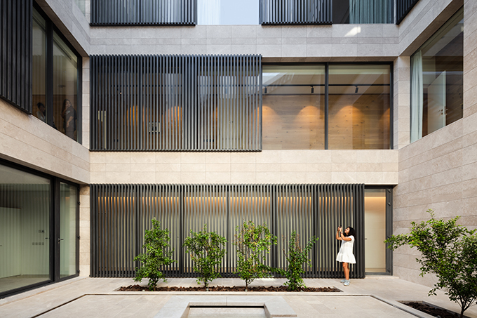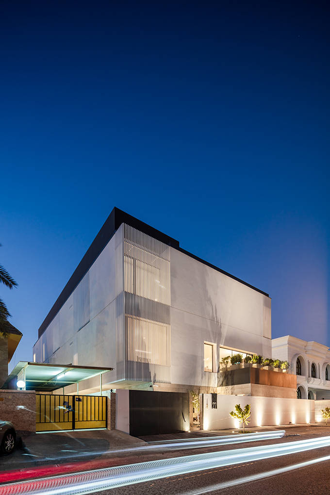 Presenting a clean and serene façade to the street, the resulting massing manifests as a white monolithic volume poised elegantly on top of a stone cladded podium. Rhythmic arrangement of louvered windows across the façade softens the volume by lending it a sense of lightness.