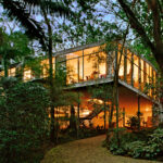 Meanwhile, the back end of the building is reserved for the kitchen, bathroom, and storage room, with a subtle variation in ceiling height. The extensive use of glass as the building’s exterior cladding allows for ample natural light to penetrate the interior spaces. The incorporation of circular steel columns effectively addresses the issue of support and establishes a sound structural foundation for the expansion of the terrace on the higher level. The diatom mud’s moisture-proof and adsorption capabilities are showcased throughout the exterior and interior, complementing the solid texture and refined micro-cement aesthetic. The previously uneven terrain has been artfully reimagined as a sleek, modern structure that seamlessly integrates with its natural surroundings. The transparent walls of the building allow for an immersive experience, where the lush greenery outside becomes an integral part of the interior space.