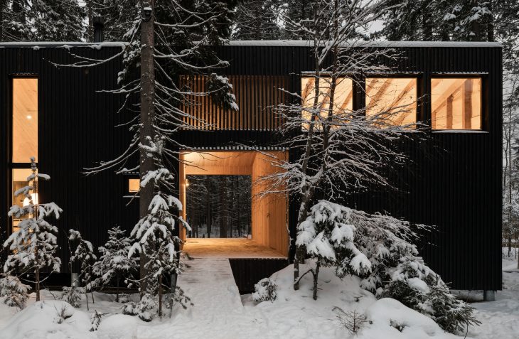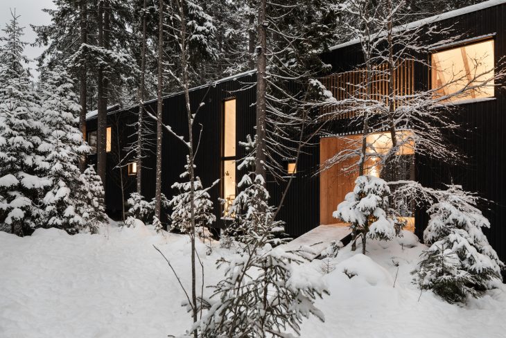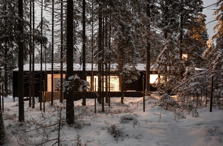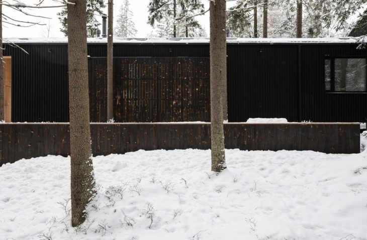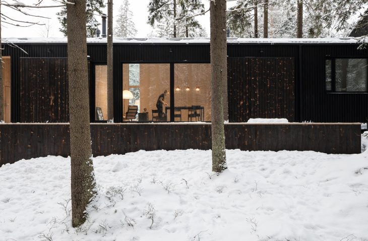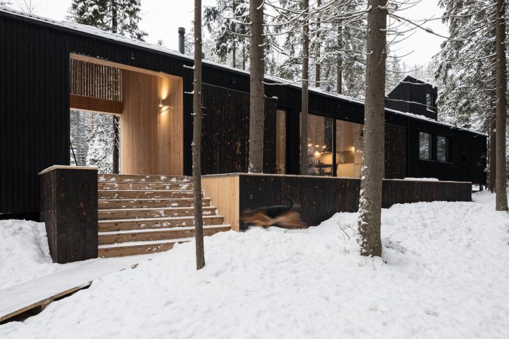 From the architects: This is a house for the family of two artists in Roschino, sixty kilometers from Saint-Petersburg. The house is located on the edge of a settlement, just by the forest. The plot is a bit sloped, it is completely covered with conifer trees and has two anthills on it. The position and dimensions of the building are predefined by the environment. A long narrow volume of the house is placed in such a way that it preserves all the flora and fauna of the site.