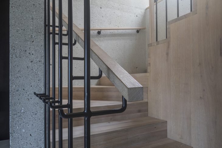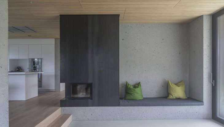All functions of the living area (living, dining, cooking and working), and the parents’ bedroom, with an en suite bathroom and dressing room, are housed on the top floor. The floor plan of the top floor is dominated by freestanding walls, loosely zoned functional areas, a central atrium and an expansive, south-west-facing terrace. Seating recesses are cut out of the thick, polished concrete walls. A central wood-fired furnace made of blackened steel, which blends harmoniously into one of the seating recesses, provides pleasant heat in the colder months. The protrusions and recesses in the building’s structure provide shelter from the wind and shade. The surrounding greenery of garden serves as an extension to the interior and forms a natural screen to protect the residents’ privacy.