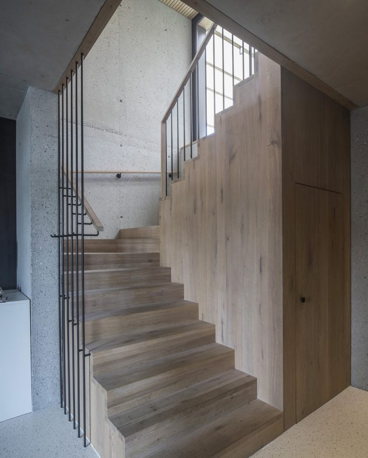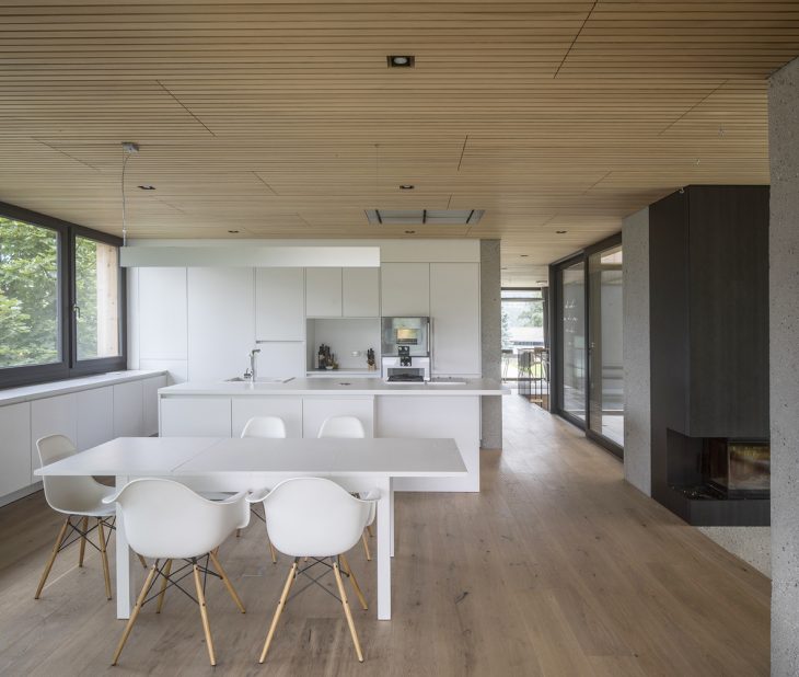 The outward appearance of the house is dominated by the sharp-edged roof made of silver fir, which rests fully on the free-standing polished concrete walls. The window reveals are made of dark brown varnished wood. The fascia and window ledges were bordered in sheet copper. In accordance with the design concept, the materials used for the exterior are also found in the interior – polished concrete walls, a silver fir soffit, and floors and interior doors made of oak for a balance of materials.