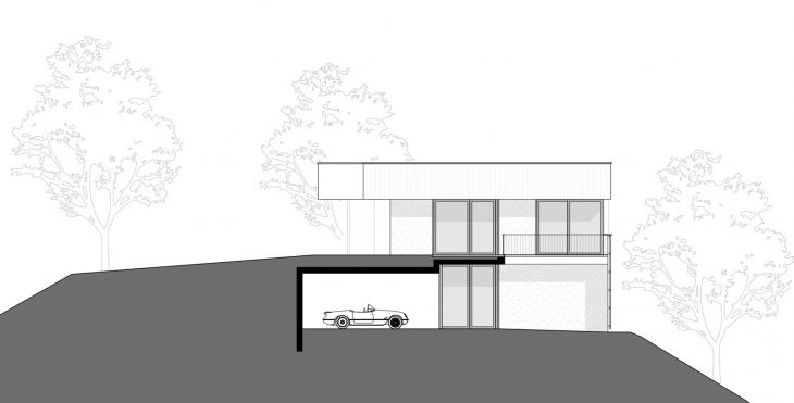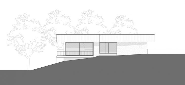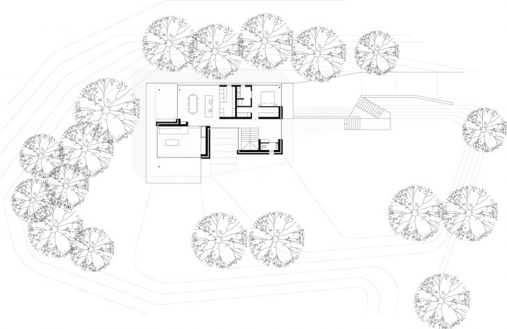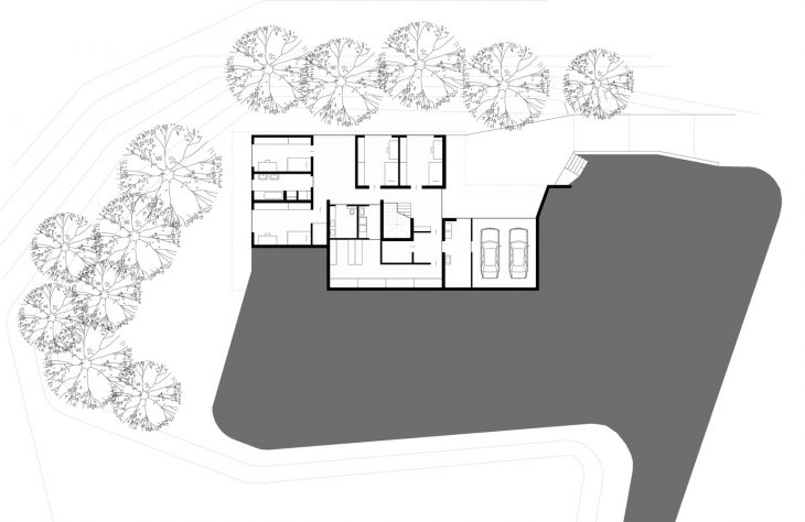 Access to the entrance area, which unites the ground floor with the top floor, is provided via the forecourt to the east, with an adjacent underground garage. The ground floor, which disappears almost completely in the slope, is reserved for the four children. Each of the children’s rooms has direct access to the garden.