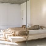 The bathroom, in contrast to the muted tones of the common areas, becomes a distinct zone, coated in grey terrazzo. Rather of clashing with the sophisticated material backdrop, various textures showcase the residents’ personalities and lifestyle.