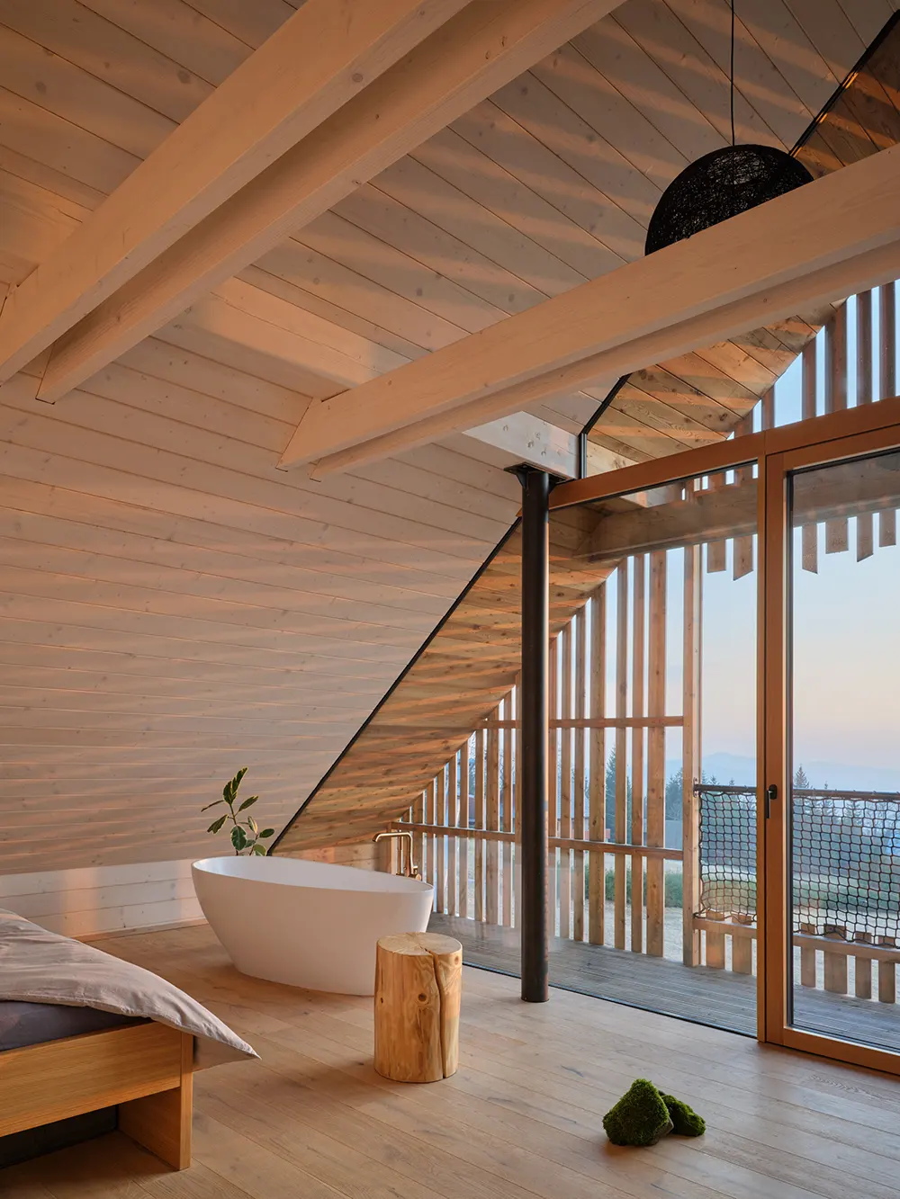 The attic contains the quiet zone of the house. SENAA architekti shaped this floor for rest, placing a bedroom with a walk-in closet and a balcony toward the views. A gable window introduces daylight deep into the room, reinforcing the connection to the site. The attic also includes a second room and a bathroom, arranged to give flexibility for guests or additional household needs. The elevation of the attic floor gives the upper rooms a sense of privacy while keeping them closely tied to the views across the mountain range.