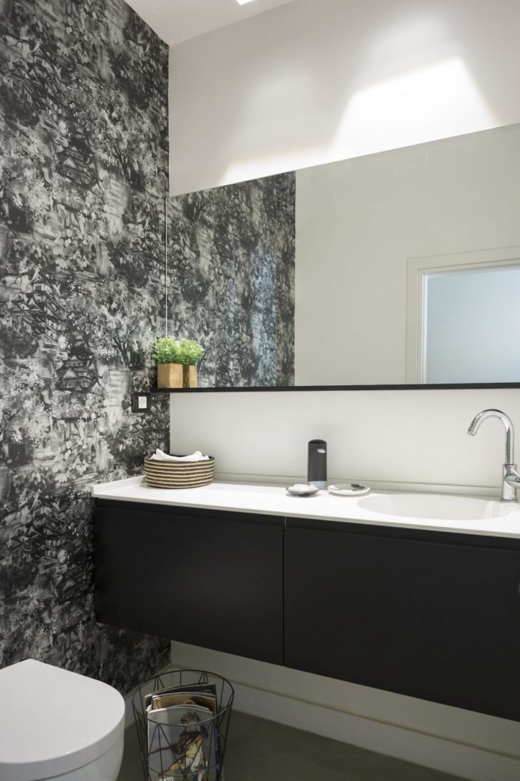 A wide glass door, located in the center of the house, divides it to two main areas – on the right hand side are the living room and dining area, and on the left are the kitchen, an extra room used as a pantry, a guest bathroom and a door leading to the backyard, where an intimate seating area was created. The guest bathroom was redesigned, using a monochrome textured wallpaper and a white corian countertop, contrasting the black custom-made cabinet.