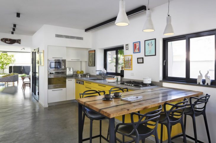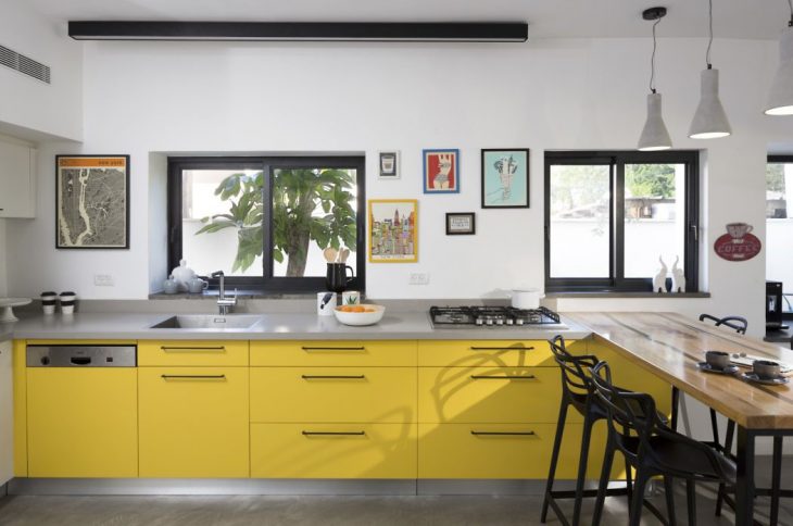 In the kitchen. The original wooden and rounded cabinets were replaced with a bright and contemporary design. It was divided into three main sections – the back wall was colored in white and features storage cabinets and the stove, the long concrete colored worktop is located underneath the big windows and features yellow cabinets with black drawer handles, and next to it is a wooden textured countertop for the family to gather and have light and casual meals together. The refrigerator is located on the opposite wall, along with extra storage.