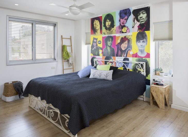 Even though the first floor was not renovated this time around, the couple wished to take advantage of the massive changes and freshen up their room, using a colorful wallpaper with a pop-art style print.